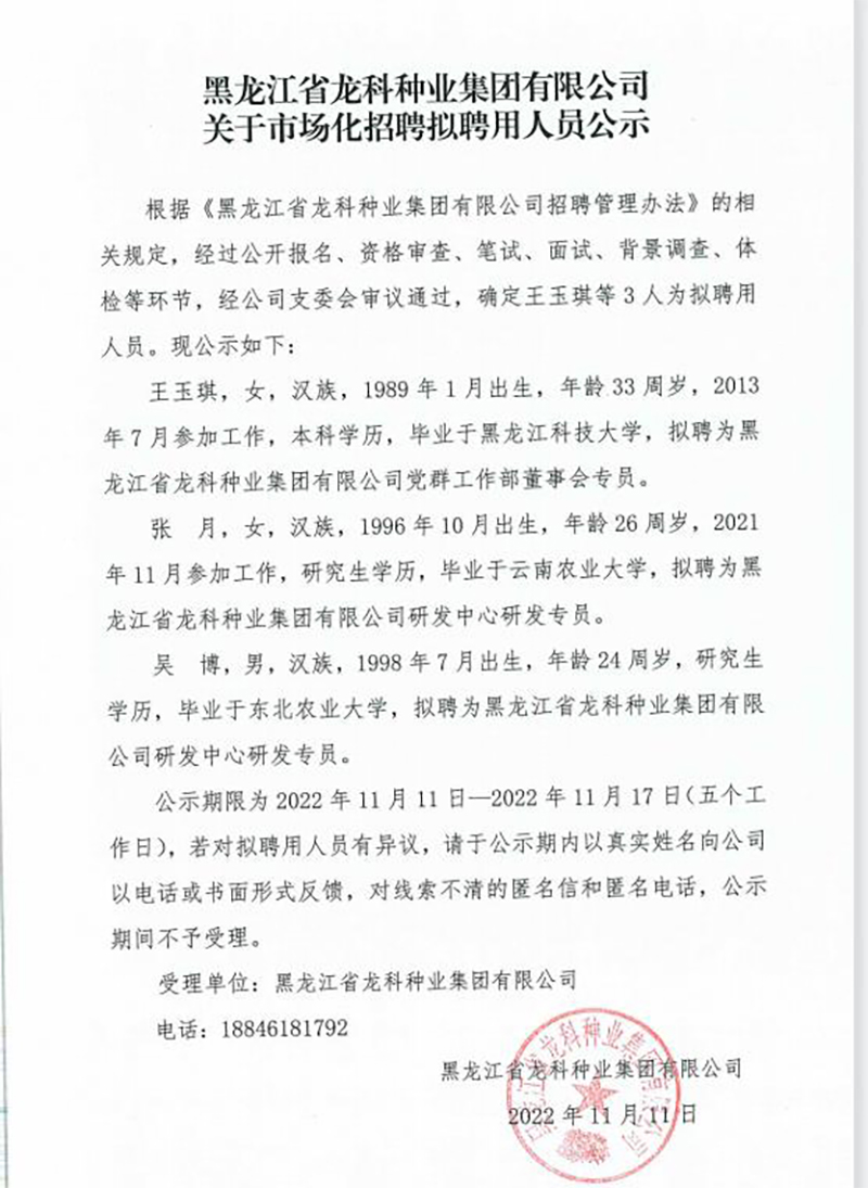 黑龍江省農(nóng)業(yè)投資集團(tuán)有限公司 關(guān)于市場化招聘擬聘用人員公示