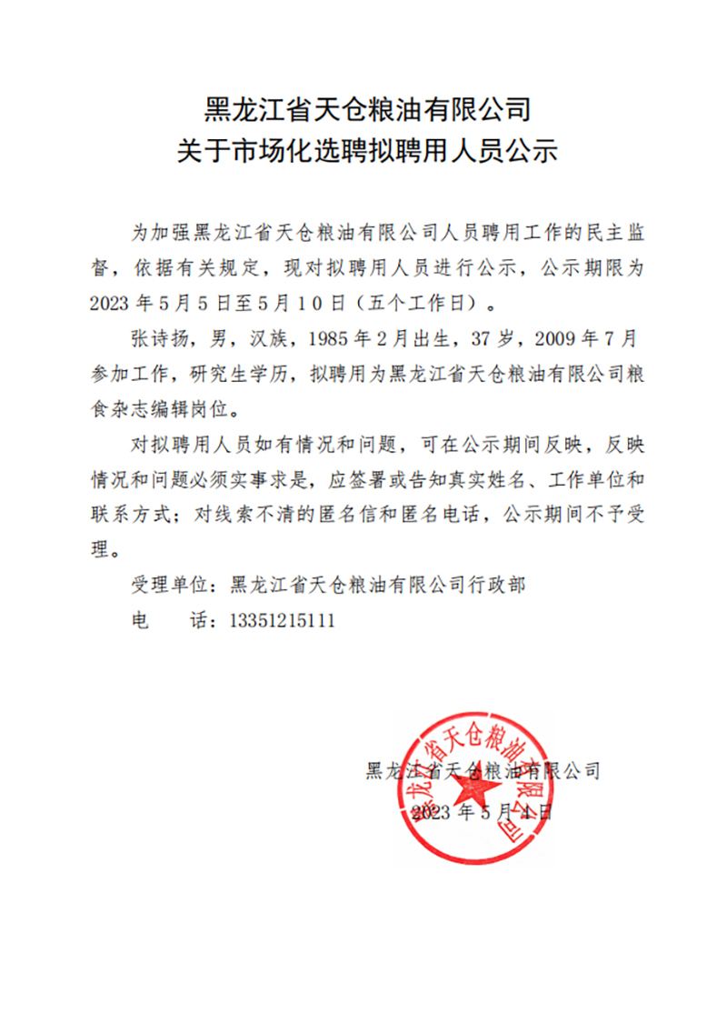 黑龍江省天倉(cāng)糧油有限公司關(guān)于市場(chǎng)化選聘擬聘用人員公示