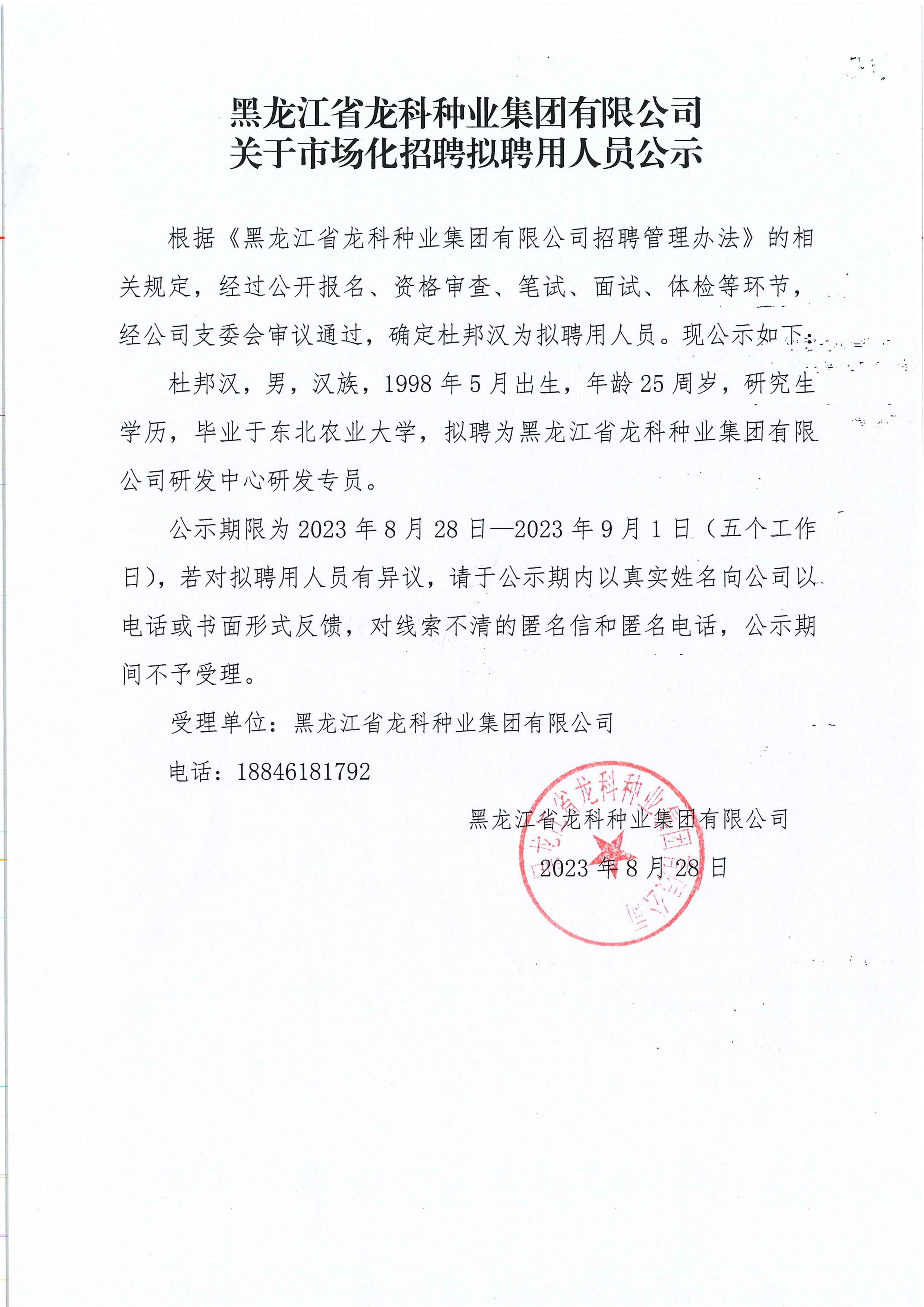 黑龍江省龍科種業(yè)集團(tuán)有限公司關(guān)于市場(chǎng)化招聘擬聘用人員公示