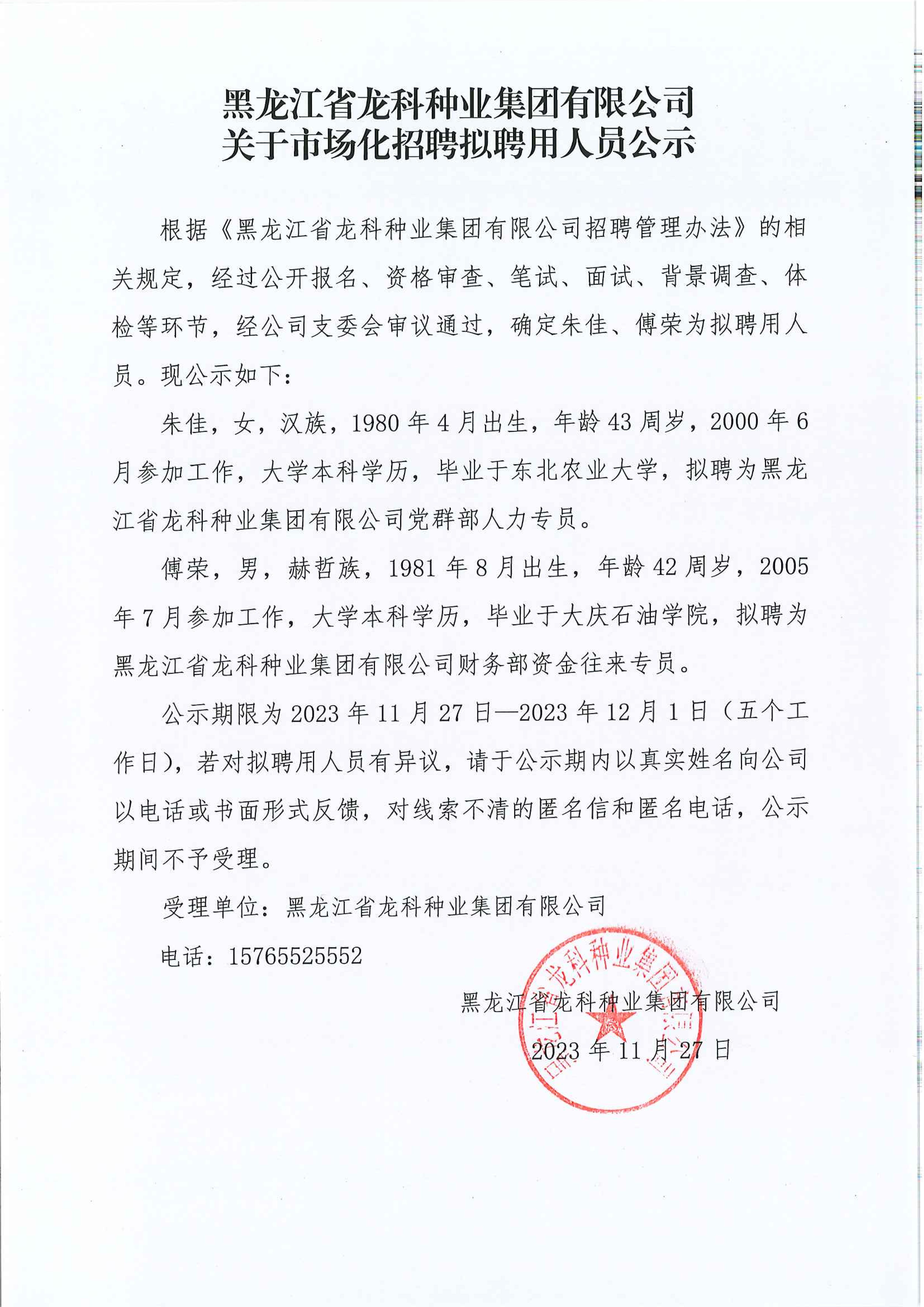 黑龍江省龍科種業(yè)集團(tuán)有限公司關(guān)于市場(chǎng)化招聘擬聘用人員公示