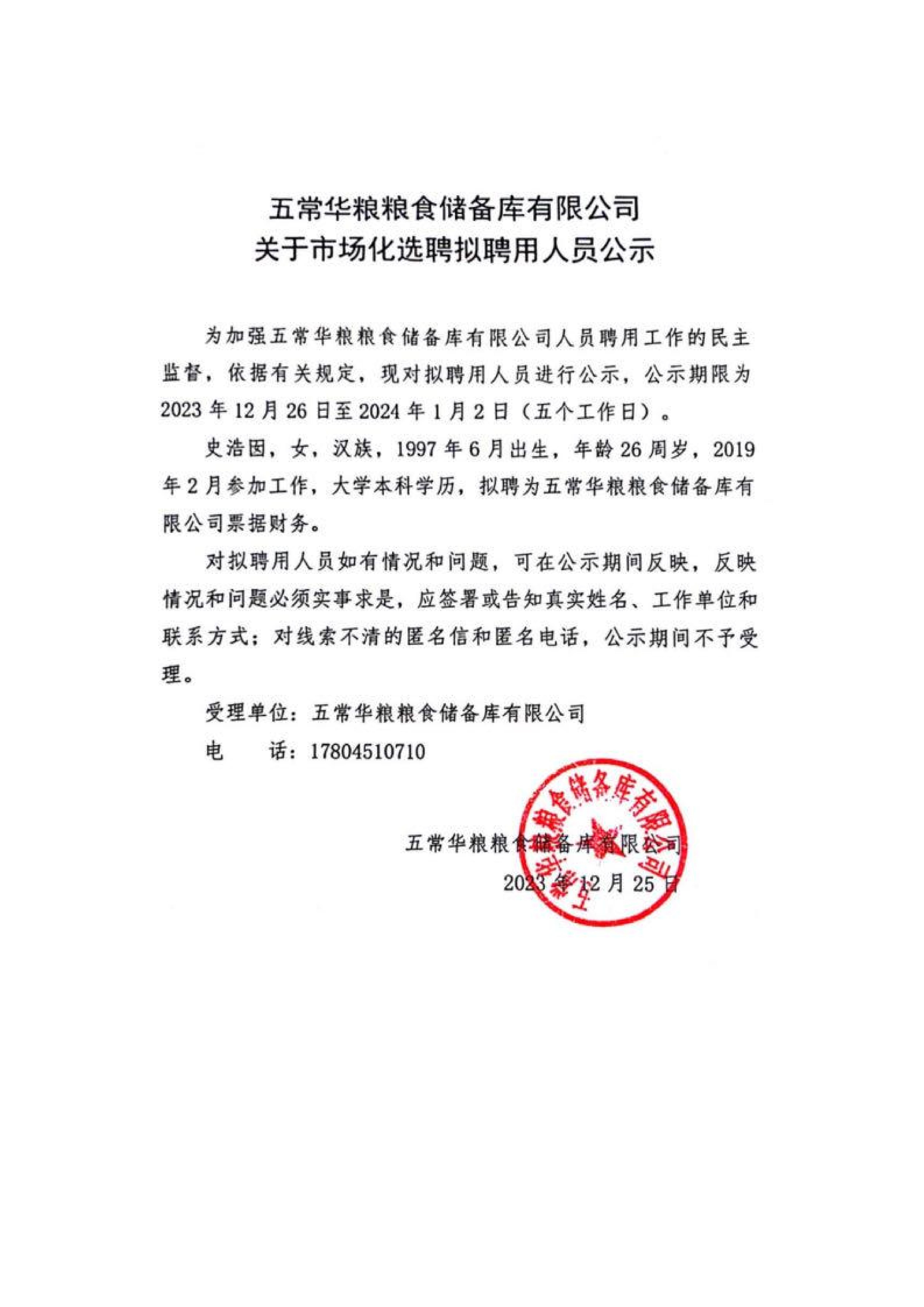 五常華糧糧食儲(chǔ)備庫(kù)有限公司關(guān)于市場(chǎng)化選聘擬聘用人員公示