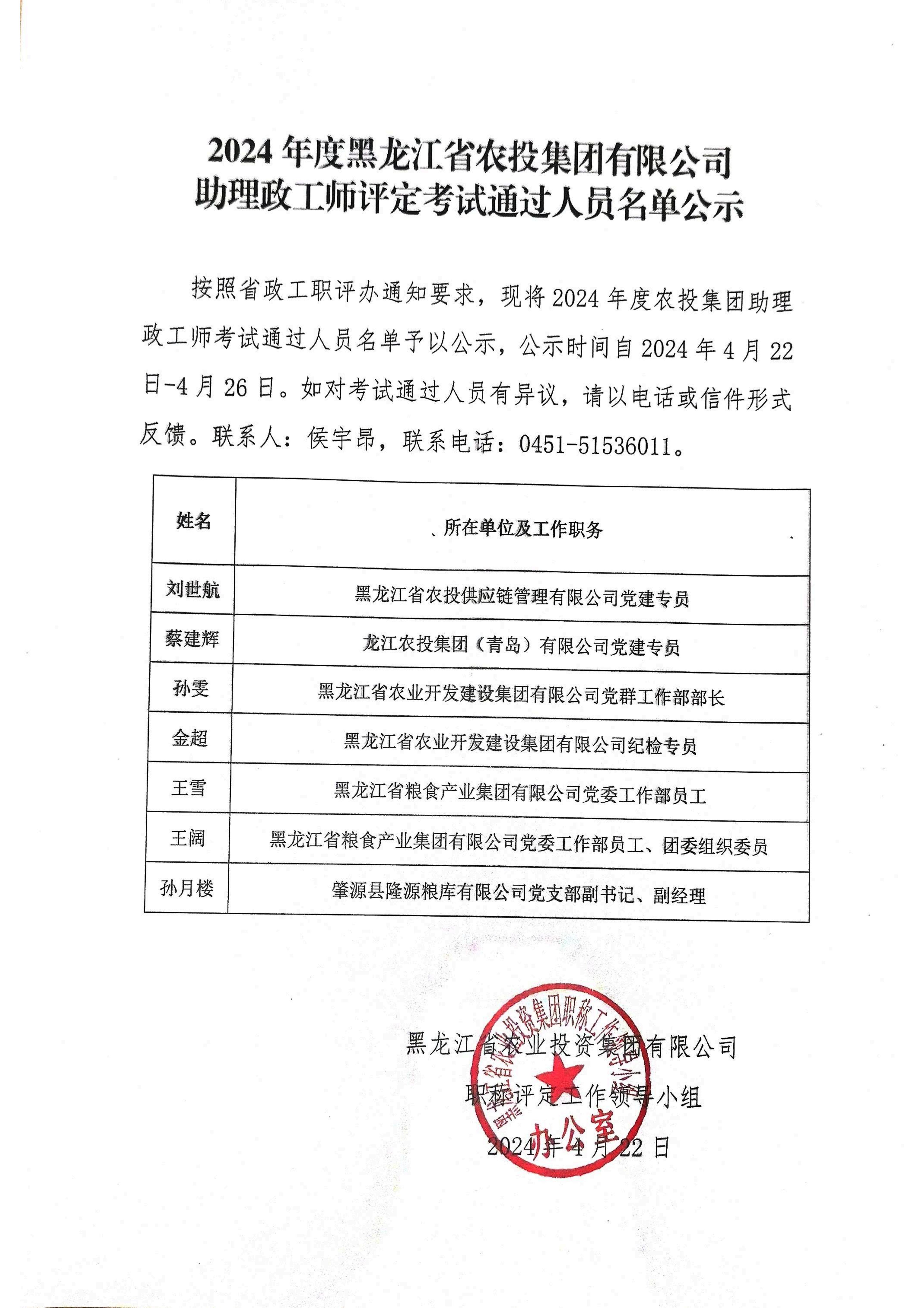 2024年度黑龍江省農(nóng)投集團(tuán)有限公司助理政工師評定考試通過人員名單公示