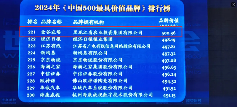 6月19日,由世界品牌實(shí)驗(yàn)室(World Brand Lab)主辦的2024年(第二十一屆)“世界品牌大會”暨2024年《中國500最具價值品牌》發(fā)布會在北京舉行。會上,發(fā)布了2024年《中國500最具價值品牌》分析報告。黑龍江省農(nóng)業(yè)投資集團(tuán)有限公司(以下簡稱“農(nóng)投集團(tuán)”)所屬農(nóng)投食品集團(tuán)“金谷農(nóng)場”品牌以500.36億元品牌價值榮登中國500最具價值品牌排行榜第221位。農(nóng)投集團(tuán)黨委書記、董事長常玉春代表農(nóng)投集團(tuán)領(lǐng)取獎杯和獎牌。