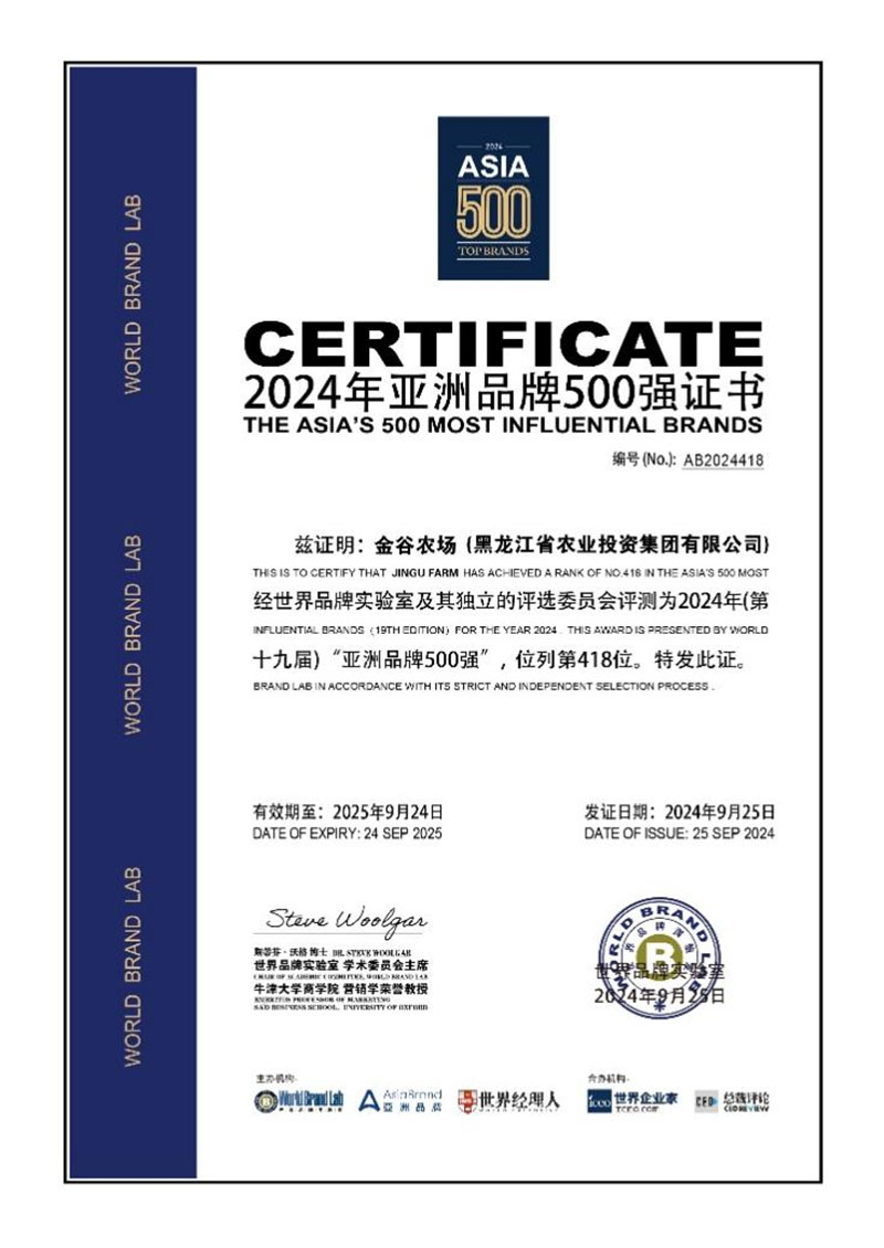 9月25日,由世界品牌實驗室(World Brand Lab)主辦的2024年“亞洲品牌大會”在香港舉行,會上發(fā)布了2024年《亞洲品牌500強》排行榜。黑龍江省農(nóng)業(yè)投資集團有限公司(以下簡稱“農(nóng)投集團”)“金谷農(nóng)場”品牌再次榮登《亞洲品牌500強》排行榜第418位,較2023年的436位,提升了18位,再一次提升了“金谷農(nóng)場”的品牌影響力和企業(yè)的核心競爭力,這一卓越成就為黑龍江省的農(nóng)業(yè)品牌發(fā)展也增添了濃墨重彩的一筆。