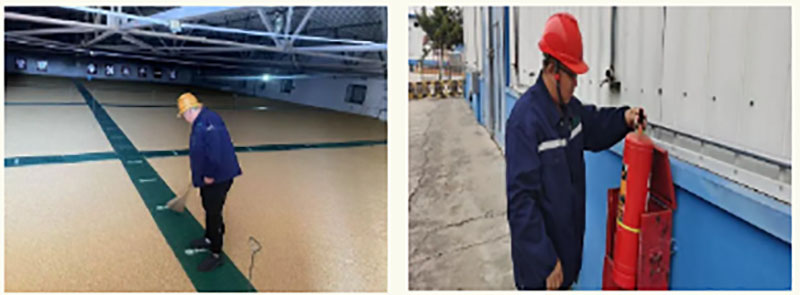 保管員清掃糧面衛(wèi)生確保糧倉(cāng)內(nèi)干凈 安全保衛(wèi)部員工檢查滅火器