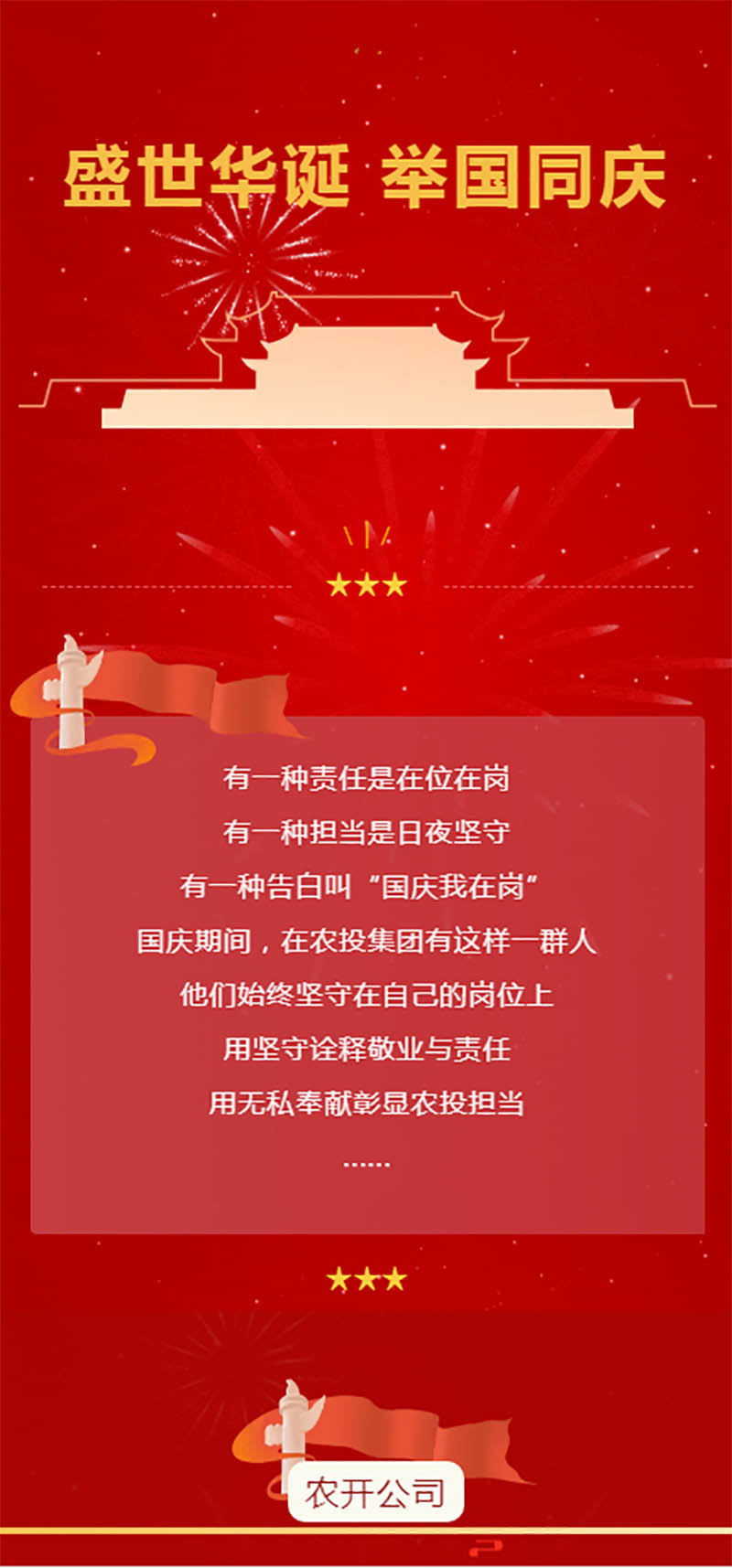 秋陽(yáng)璀璨,金風(fēng)送爽。在國(guó)慶佳節(jié)之際,農(nóng)開公司的全體員工深知使命與職責(zé),時(shí)刻準(zhǔn)備、迅速響應(yīng),以更為飽滿的熱情、更為專注的態(tài)度、更為卓越的執(zhí)行力,堅(jiān)守崗位,他們忙碌的身影穿梭在各個(gè)角落。為了保障農(nóng)業(yè)基礎(chǔ)設(shè)施的建設(shè),為了推動(dòng)鄉(xiāng)村振興的步伐。他們以實(shí)際行動(dòng)向中華人民共和國(guó)成立 75 周年獻(xiàn)禮,用汗水和奉獻(xiàn)詮釋著對(duì)祖國(guó)的熱愛與忠誠(chéng)。