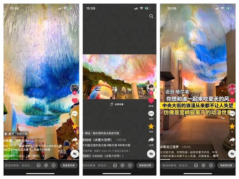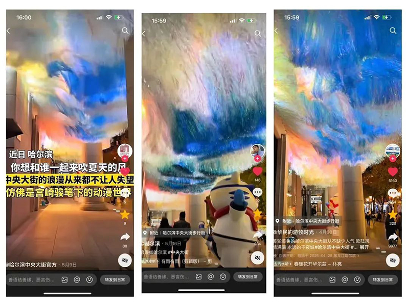 立足“酒店即目的地”的發(fā)展定位,金谷大廈借鑒西安、廈門等城市網(wǎng)紅地標(biāo)運(yùn)營經(jīng)驗,于避暑旅游旺季來臨前完成“天空之境”主題美陳場景建設(shè)。該場景占地約66平方米,以動態(tài)藝術(shù)裝置重構(gòu)空間美學(xué)——采用特種細(xì)絲面料打造由北向南延展的“爾濱浪花”矩陣,通過微風(fēng)動力學(xué)裝置模擬江海與天穹的光影交織,構(gòu)建虛實交融的沉浸式視覺空間。自落成以來,該場景日均吸引游客及攝影創(chuàng)作者超2000人次,在抖音、小紅書等平臺形成“#爾濱天空之境”話題矩陣,相關(guān)短視頻播放量突破1200萬次,成功躋身哈爾濱城市地標(biāo)打卡熱榜TOP10。