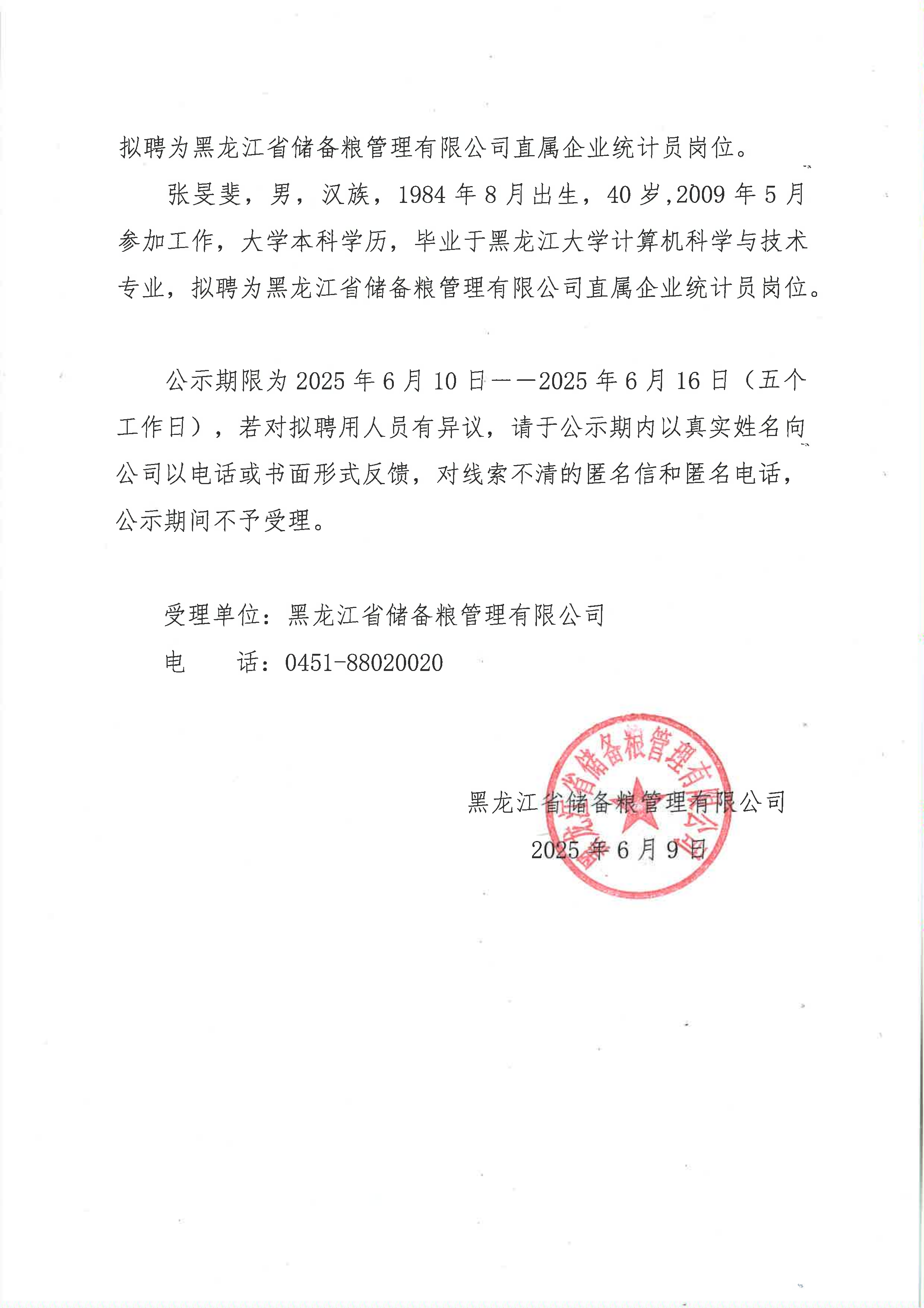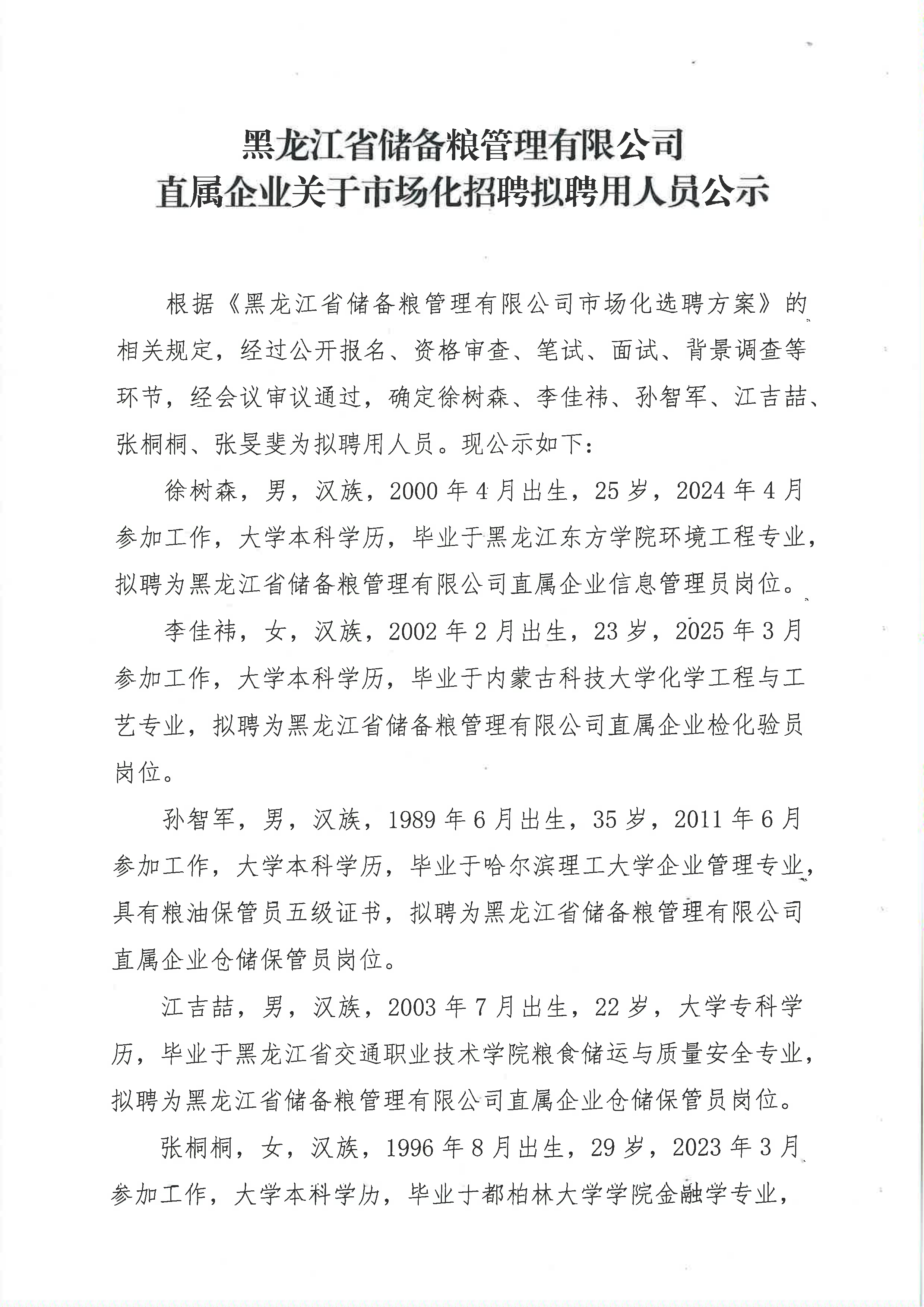 黑龍江省儲(chǔ)備糧管理有限公司直屬企業(yè)關(guān)于市場化招聘擬聘用人員公示