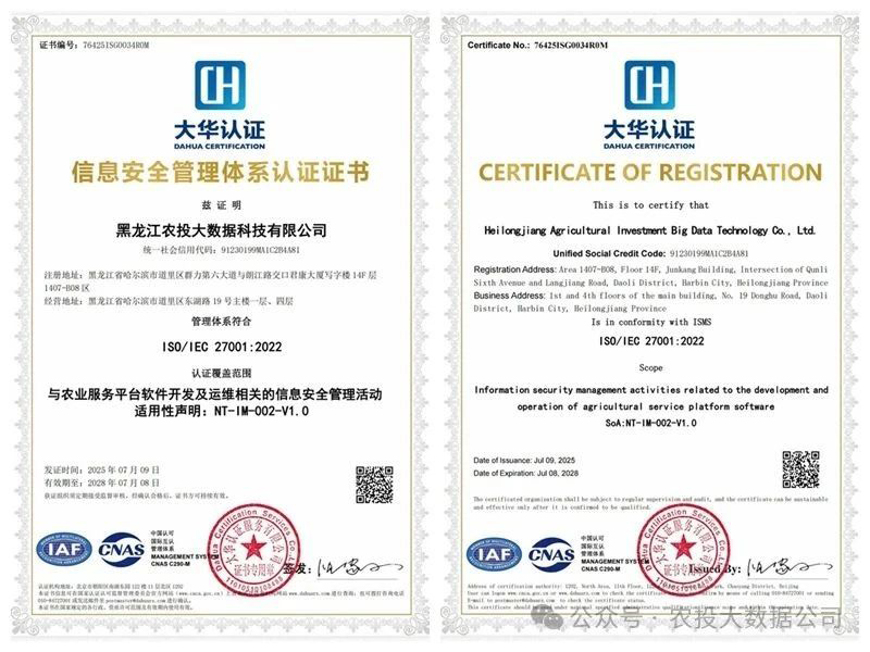 ISO/IEC 27001作為全球信息安全管理體系的權(quán)威標(biāo)準(zhǔn),其核心在于建立系統(tǒng)化的安全策略、實(shí)施嚴(yán)格的風(fēng)險(xiǎn)管控、并確保數(shù)據(jù)在采集、傳輸、存儲(chǔ)、處理、共享直至銷毀的全流程中得到全方位保障。大數(shù)據(jù)公司成功獲此認(rèn)證,深度契合國(guó)家“強(qiáng)化數(shù)據(jù)安全、護(hù)航數(shù)字經(jīng)濟(jì)”的戰(zhàn)略導(dǎo)向,以及黑龍江省大力發(fā)展數(shù)字經(jīng)濟(jì)、建設(shè)“數(shù)字龍江”、筑牢國(guó)家糧食安全網(wǎng)絡(luò)防線的核心任務(wù),為龍江數(shù)字農(nóng)業(yè)的騰飛奠定了由國(guó)際標(biāo)準(zhǔn)認(rèn)證的安全基石。