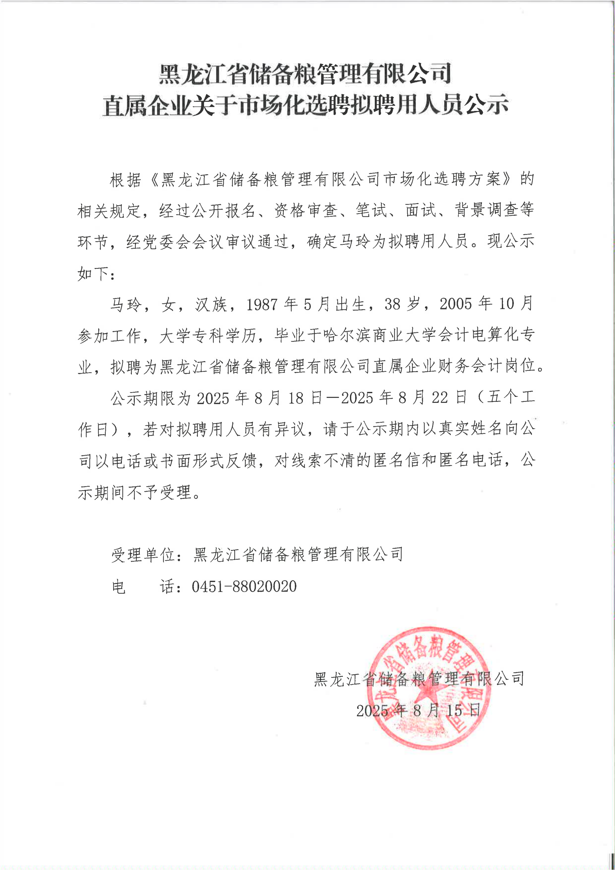黑龍江省儲(chǔ)備糧管理有限公司直屬企業(yè)關(guān)于市場(chǎng)化選聘擬聘用人員公示