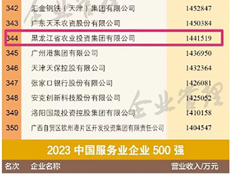 2023年9月20日,中國企業(yè)聯(lián)合會、中國企業(yè)家協(xié)會發(fā)布“2023中國服務業(yè)企業(yè)500強”榜單,黑龍江省農(nóng)業(yè)投資集團有限公司(以下簡稱“農(nóng)投集團”)連續(xù)三年榮登“中國服務業(yè)企業(yè)500強”,以144億元的營業(yè)收入,位列“2023年中國企業(yè)500強”第344位,位次較2022年度上升24位!