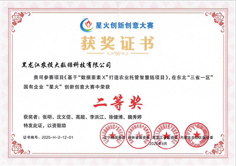 東北“三省一區(qū)”山水相連、人文相親、產(chǎn)業(yè)相融,國資國企發(fā)展資源優(yōu)勢(shì)和條件機(jī)遇相似,在科技創(chuàng)新合作有著深厚基礎(chǔ)。 2024年11月至2025年4月,遼寧省國資委、吉林省國資委、黑龍江省國資委、內(nèi)蒙古自治區(qū)國資委聯(lián)合舉辦了東北“三省一區(qū)”國有企業(yè)“星火”創(chuàng)新創(chuàng)意大賽,“三省一區(qū)”的161個(gè)項(xiàng)目分獲一、二、三等獎(jiǎng)。農(nóng)投大數(shù)據(jù)公司憑借“基于‘?dāng)?shù)據(jù)要素×’打造農(nóng)業(yè)托管智慧鏈項(xiàng)目”從全省百余個(gè)參賽項(xiàng)目中脫穎而出,榮獲大賽二等獎(jiǎng)。