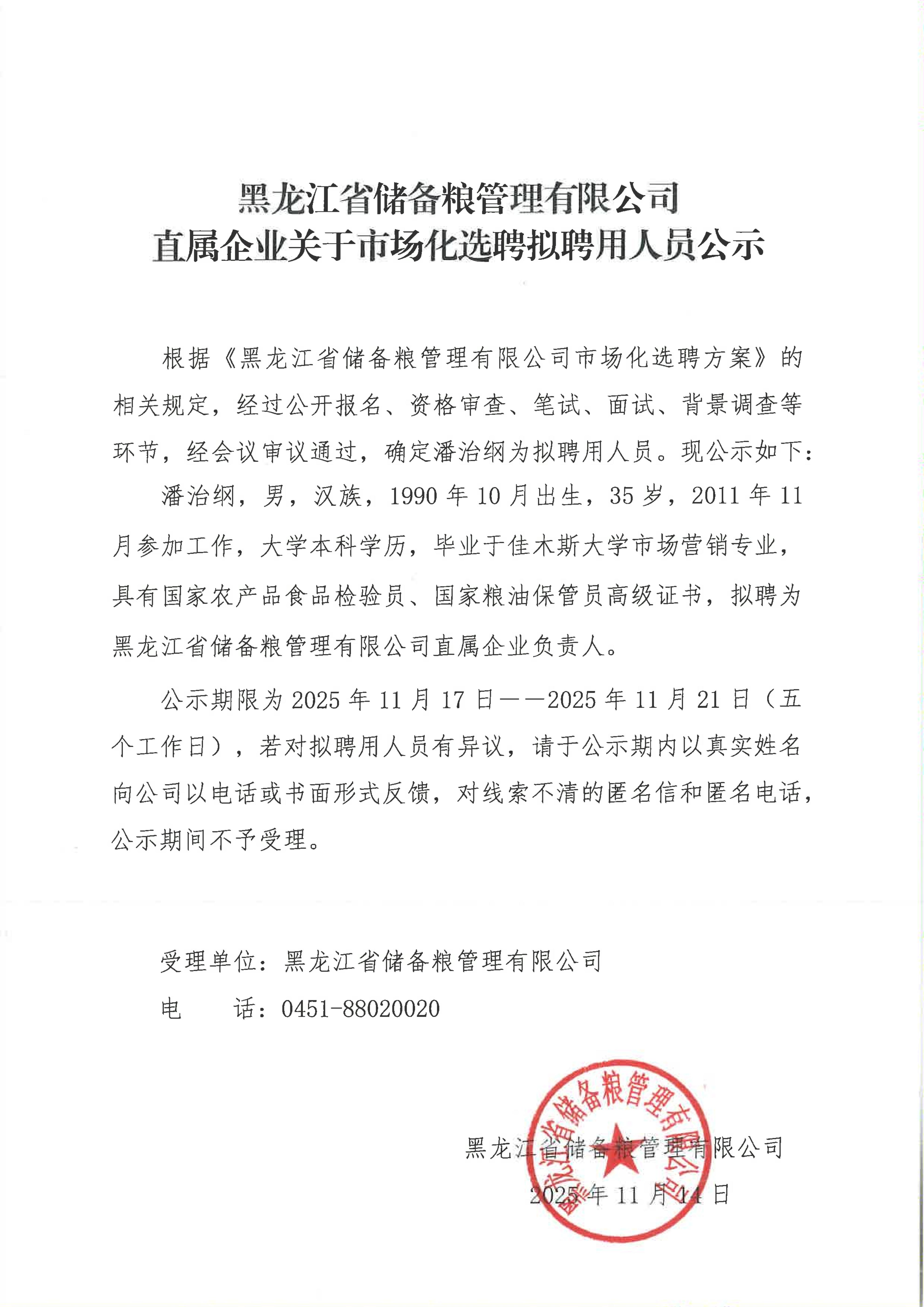 黑龍江省儲(chǔ)備糧管理有限公司直屬企業(yè)關(guān)于市場(chǎng)化選聘擬聘用人員公示